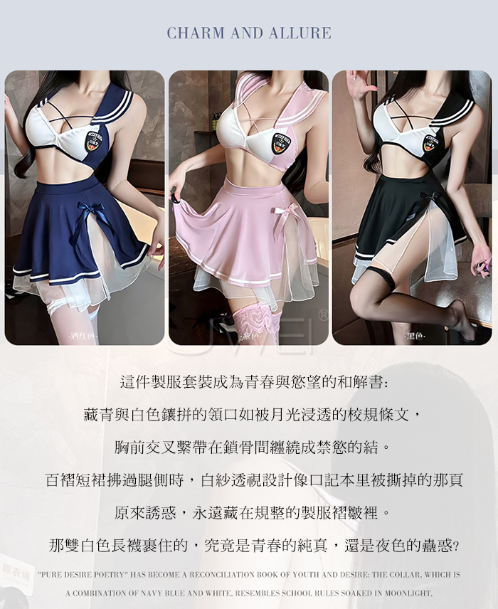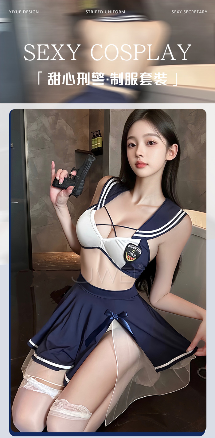 ►您現在的位置:首頁>甜心刑警.胸前交叉繫帶清純百褶透視白紗COS制服套裝【上衣+短裙-藍+白】